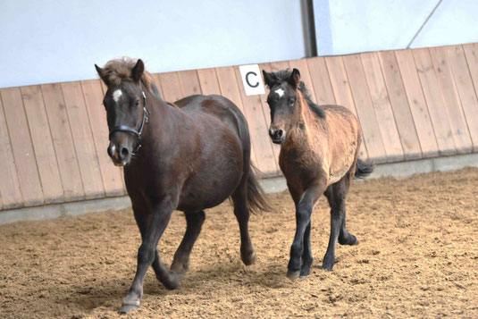 Langliniges Stutfohlen mit sehr guter Tempofähigkeit im Tölt, Trab im Ansatz und eher weiten Bewegungen