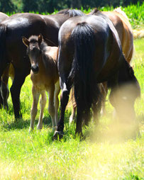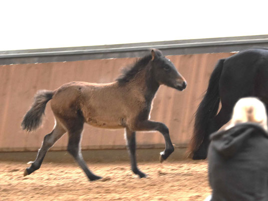 Hochaufgerichtetes Hengstfohlen, 5-Gang veranlagt, mit hochweitem, mühelosen Bewegungsablauf in Trab und Tölt und sehr gutem Tempo